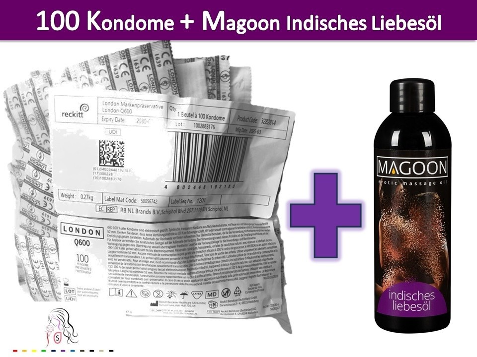 ♥ 100 LONDON Kondome Feucht Q600 + 50ml – 200ml Magoon Indisches Liebesöl